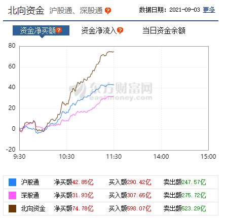 【北向资金净流入74亿元】截止午间收盘,北向资金净流入74.78亿元。