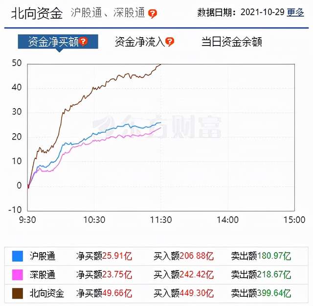 【北向资金净流入近50亿元】截止午间收盘,北向资金净流入49.66亿元。
