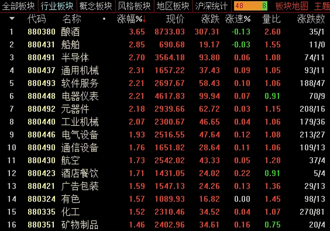 早盘A股各指数高开高走,上证50指数涨超1%,权重股贵州茅台盘中大涨4%。白酒股集体走强,老白干酒、岩石股份涨停,迎驾贡酒再创新高。军工、汽配股拉升,板块内均有超10股封板。高景气赛道板块反弹,概念题材活跃,总体上个股迎来普涨,超3100家飘红,但市场成交缩量明显,沪深两市半日成交额超6700亿元。盘面上,中船系、白酒、国防军工、汽车零部件等板块涨幅前列,煤炭、房地产、EDR、银行等板块跌幅居前。
