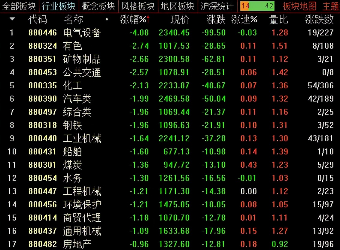 沪指早盘震荡下跌,创业板指跌近2%。盘面上,医药相关板块集体大涨,中药板块领涨,红日药业20CM涨停,佐力药业、陇神戎发涨超10%,精华制药、大理药业、龙津药业、中恒集团涨停。食品加工板块早盘震荡走强,绝味食品涨停,味知香、朱老六、恰恰食品、盖世食品、煌上煌、安井食品等跟涨。今日涨幅居前的以防御类板块为主。锂电池相关板块今日全线下跌,宁德时代跌超7%。高位股方面严重分化,罗曼股份、龙津药业涨停3连板,汇绿生态、物产环能跌停。此外三湘印象盘中上演地天板,盛泰集团盘中上演天地板。总体上个股跌多涨少,超3300只个股下跌。盘面上,中药、NFT、医药电商、食品加工制造、农业服务等板块涨幅前列,盐湖提锂、稀土永磁、汽车整车、锂电池、电力网联网等板块跌幅居前。