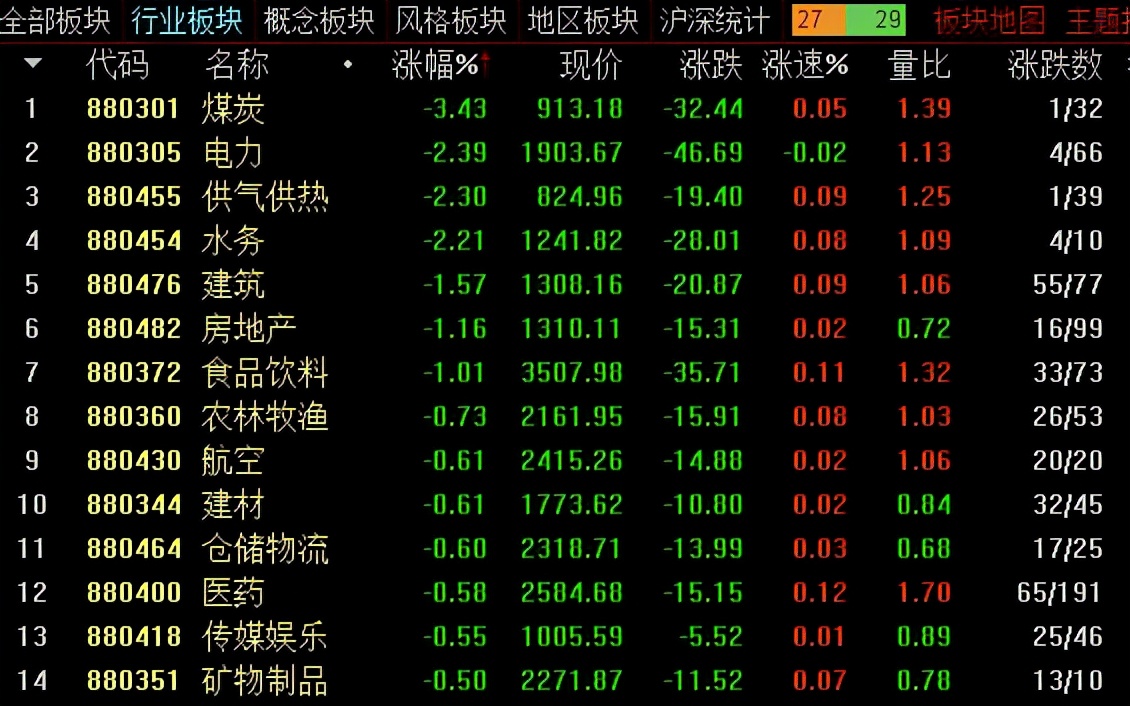 今天上午上证指数和中证500跌0.16%和0.35%,其余6指数均翻红。个股涨跌比为2079:1908,总体涨多跌少,但沪市是跌多涨少。主要是煤炭、电力、房地产、白酒、石化等继续调整。