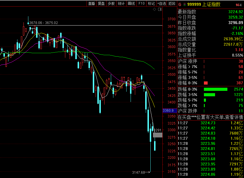截止午间收盘,沪指跌2.16%,深成指跌2.46%,创业板指跌2.55%。个股涨跌比:2271808,2852197,有37股涨幅超10%以上,跌幅10%以上的个股有7只。今天上午成交量6085亿,比昨上午缩量1077亿。
