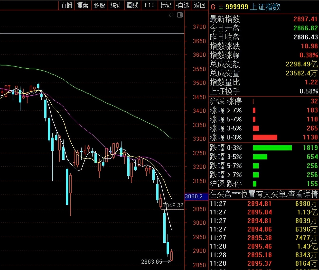 在我看来,大盘何时企稳,就应关注跌停股的数量何时大幅削减,前天700多只,昨305只,今上午111只,以确定平仓盘是否完结,大盘也就见底了。但是,大盘想重归升途,监管层必须对症结问题纠偏,讲清楚政策导向,给市场明确的预期,稳定市场的信心。社保、养老、保险资金,乃至国家队必须大量进场,成交量必须有明显放大。否则,2800点见!