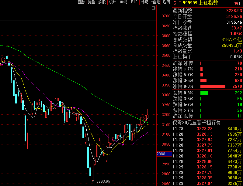 下午关注:大盘下方能否收在3200点之上,上方能否收在3230点之上?上涨个股数能否继续扩大?成交量能否超万亿?