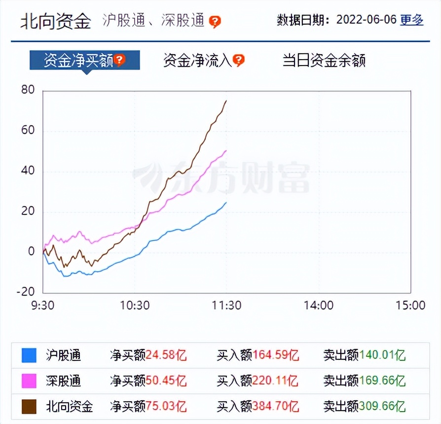 【北向资金净流入75亿元】截止午间收盘,北向资金净流入75.03亿元。