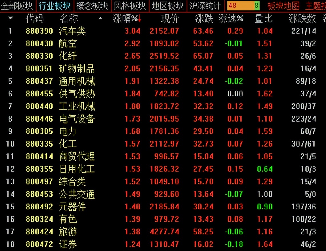 上午大盘低开高走,三大指数全线上涨,创业板指领涨。盘面上,汽车零部件板块表现活跃,广东鸿图等多股涨停。稀土永磁板块走强,广晟有色涨停。此外,军工、电力、光伏、煤炭等多个板块轮番活跃。早盘市场呈现板块热点快速轮动的特征。下跌方面,农业相关板块陷入调整。总体上个股涨多跌少,两市超3600只个股上涨。