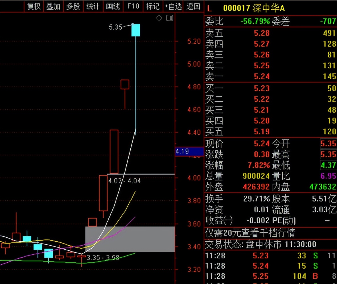 【深中华A上演“天地板”】此前4连板的深中华A盘中上演“天地板”,成交金额2.29亿。该股今日涨停开盘,随后快速下行一度触及跌停。