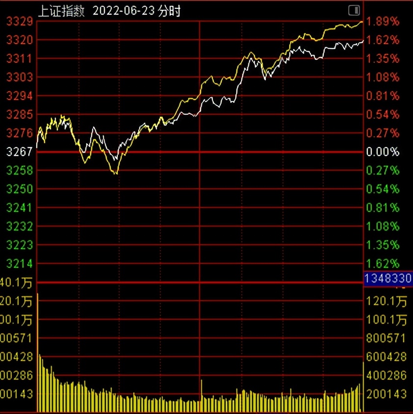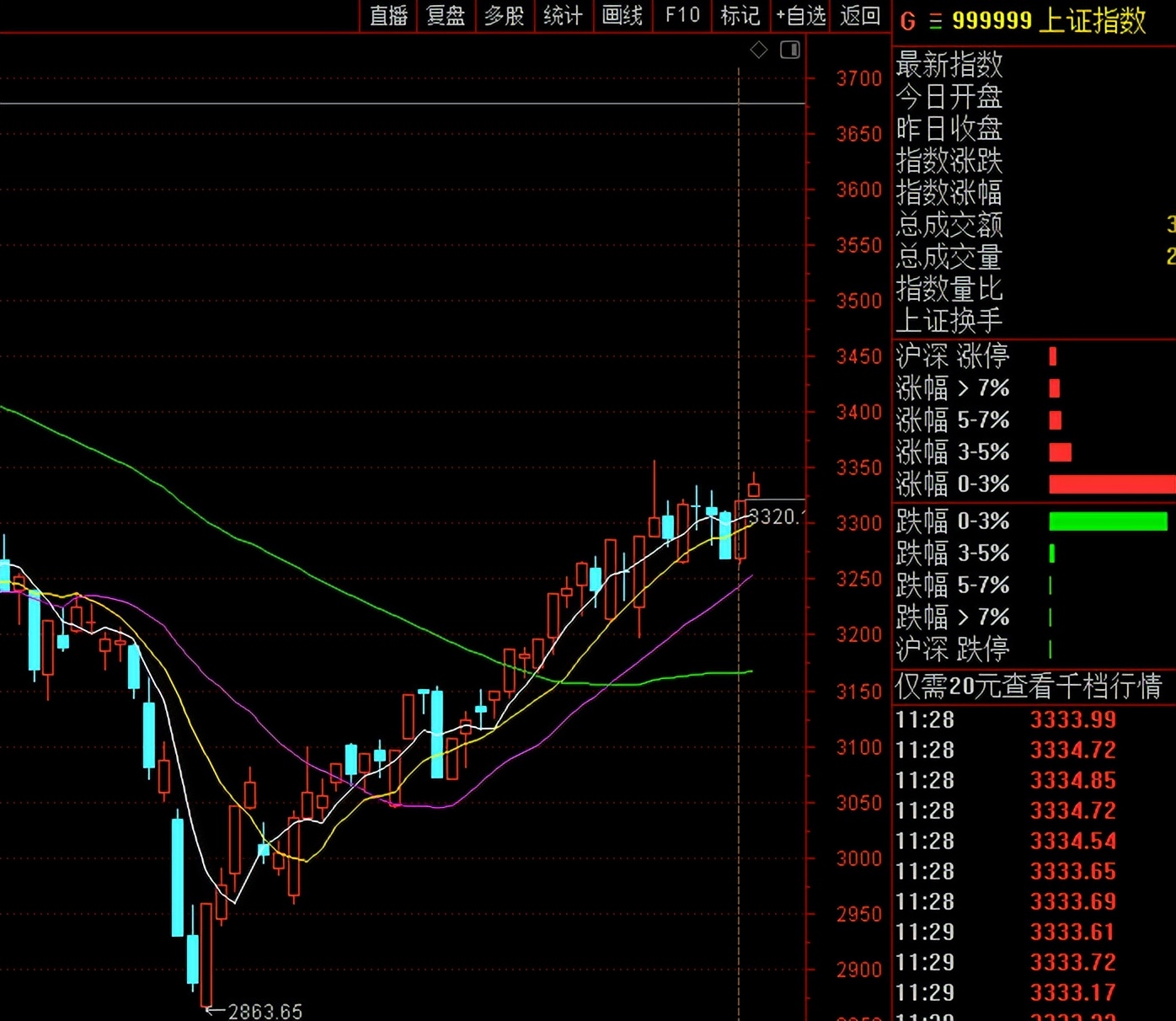 在昨大盘冲破半年线,创出3320点收盘新高后,今上午大盘继续放量上攻,高开高走最高3347点,探底3322点,午前收3334点。首次站在3330点关键位之上。
