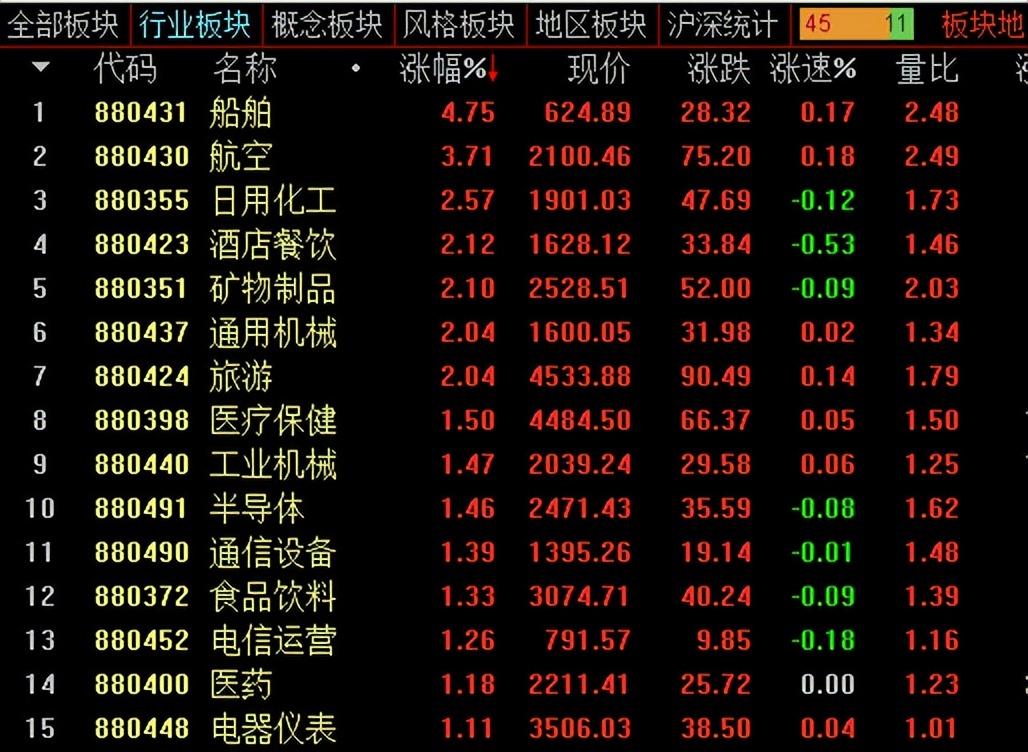 上午大盘高开后震荡走高,延续反弹之势,创业板指领涨。盘面上,军工相关板块集体走强,江龙船艇20CM涨停。医美概念股大涨,朗姿股份等涨停。半导体、旅游、风电、CRO等板块均有所活跃,整体上板块热点呈现轮动特征。下跌方面,汽车产业链个股陷入调整。高位股继续下挫,中通客车等跌停。总体上个股涨多跌少,两市超2700只个股上涨。板块方面,国防军工、培育钻石、碳纤维、医美概念等板块涨幅居前,猪肉、电力、煤炭、汽车零部件等板块跌幅居前。