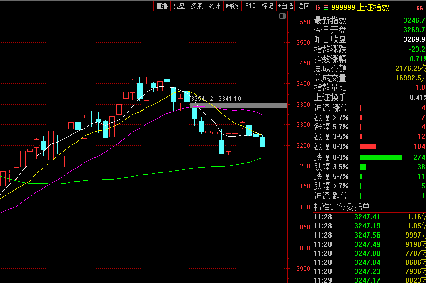 继上周五探底3246点之后,今大盘在冲高3273点后,继续探底,午前收至上周五低点3246点。宁德时代、比亚迪、茅台三大标杆股齐跌,尤其是创业板第一权重股宁德时代的下跌,使创业板跌幅最大1.33%。个股又是悬殊的跌多涨少1244:3296,涨跌停的个股比也越来越接近38:11,而成交量越来越萎缩。