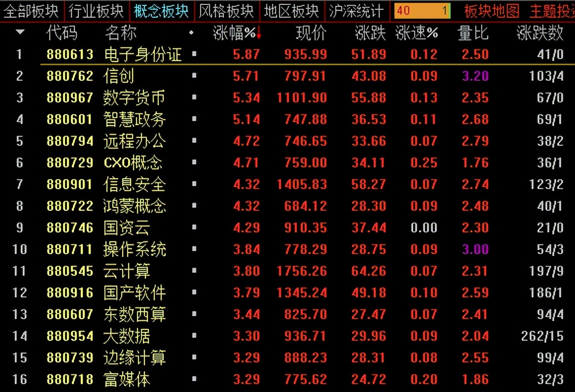 【信创、数字经济方向继续发酵 十余股涨停】创业板科创信息拉升封板,国脉科技、南天信息、神州数码、延华智能、海量数据、英飞拓等多股此前涨停,中国软件、金山办公、卓易信息、中科江南、数字认证等继续走高。