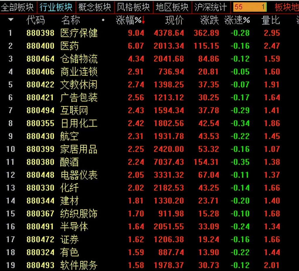 上午大盘受隔夜外围股市大涨影响高开,随后震荡走高,创业板指领涨。盘面上,医药股全线大爆发,涨幅前10的板块全部为医药相关板块,其中医疗器械方向领涨,板块内超20股涨超10%,药明康德、长春高新、恒瑞医药涨停。教育板块大涨,中公教育、凯文教育涨停。数字经济概念股继续活跃,创业板股科创信息2连板,国脉科技5连板。总体上个股涨多跌少,两市超4300只个股上涨。板块方面,医疗器械、CRO、生物制品、辅助生殖等板块涨幅居前,养殖等少数板块下跌。