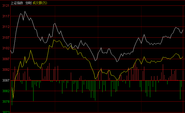 上午,对房地产股、金融股的大幅反弹,市场仍有恐惧心理,抛盘仍然很大,一度涨跌比对半,下跌个股仍然不少。只是收盘前大盘指数在3100点站稳后,上涨的中小市值成长股才多了起来。人们对于再冲3100点整数关时,大盘股拉动,白线在上黄线在下,应理性对待,乐以观之。