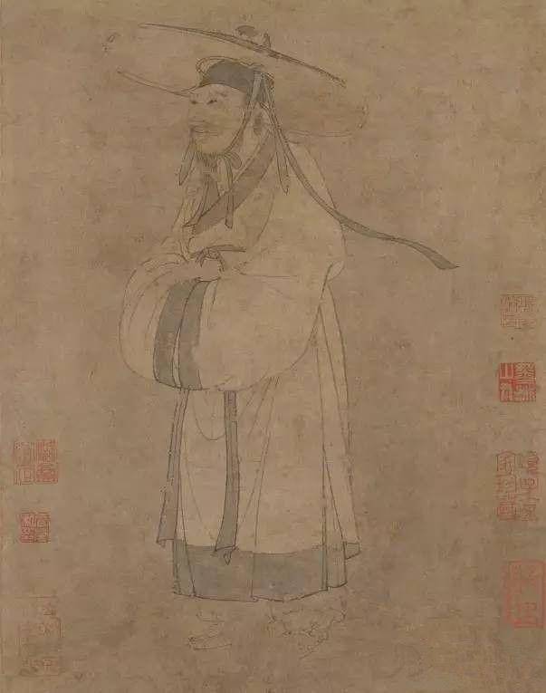 内容摘要:元代赵孟頫白描画杜甫像轴绢本,250cmx61厘米,北京故宫博物院藏。本幅为白描画杜甫戴笠独行侧身像,用笔简洁、遒劲有力、笔墨转换自然流畅,所绘人物造型准确,表情自然生动,衣纹衣带之描绘颇得吴道子之衣钵。无作者款、印,明初人题谓赵孟頫画。上有刘崧、解缙题跋