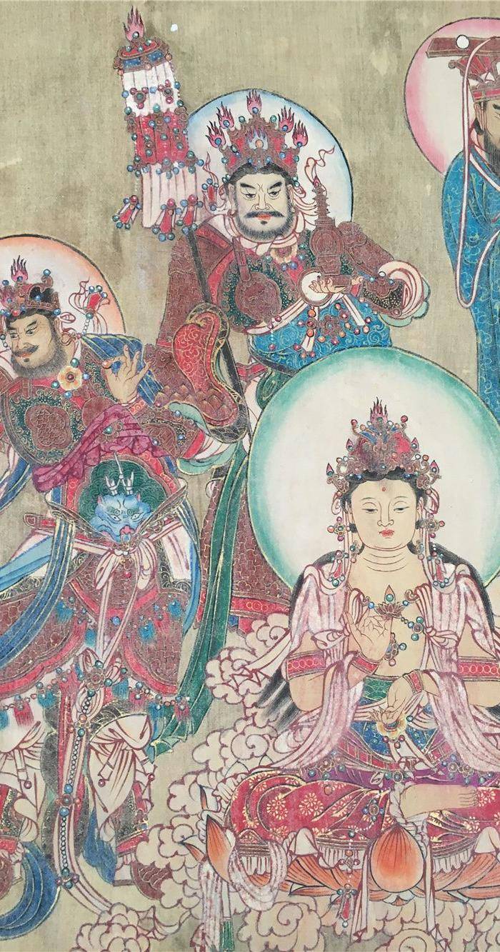 横61.9cm本幅款署:“乾隆二十六年长至月。臣丁观鹏恭绘。钤“臣观鹏”白方印、“恭画”朱方印清内府收藏印有:“乾隆御览之宝”朱长圆印、“乾隆鉴赏”白圆印、“三希堂精鉴玺”朱长方印、“宜子孙”白方印、“秘殿珠林”朱长方印。乾隆二十六年是1761年,此幅应是丁观鹏晚年的精品之作。图绘《观经》中释迦佛为韦提希夫人讲法的情景。画面中除神态端庄的佛祖外,还有四大金刚、迦叶、阿难、金刚力士等宗教人物以及合掌跪拜、虔诚祈福的韦提希夫人。作者以深湛的功力生动地刻画了“人与神相连通灵”的境界,营造出一种肃穆祥和的氛围。手法上采用“勾勒填金”的方式,以泥金为墨绘在瓷青纸上,使画面色泽深重雅丽。用笔精细,线条细劲、圆转、流畅,以“钉头鼠尾”描表现的衣纹于规整中又平添几分洒脱。