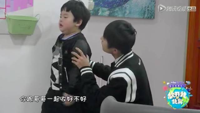 易烊千玺马上蹲到他身边,笑着告诉他,“你很棒啊,你中午收餐具的时候收拾的特别好”。并且摸着噗噗的手臂,微笑着问他:“你跟哥哥一起去收餐具好不好”