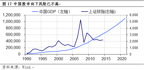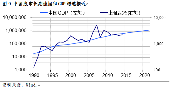 2005-2007年,中国股市连续3年大幅上涨,股市年均涨幅113%,超过20%的GDP增速;随后,2007-2014年,股市连续8年下跌,年均涨幅-12%;