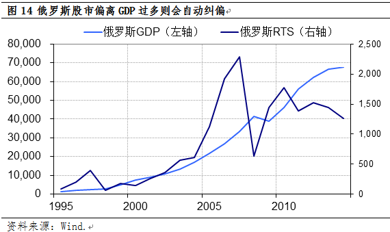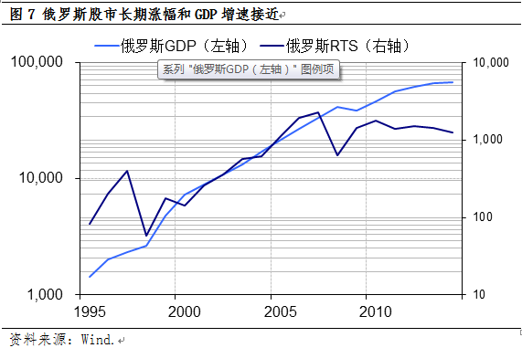 1995-2014年,俄罗斯GDP年均增速22.51%,股市年均增速15.38%;