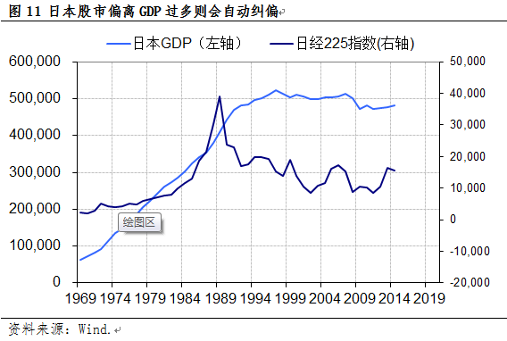 1969-2014年,日本GDP年均增速4.7% ,股市年均涨幅4.2%;1989-2014年,日本GDP年均增速0.7% ,股市年均涨幅-3.6%。