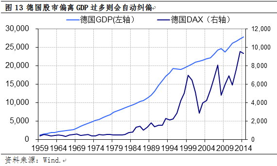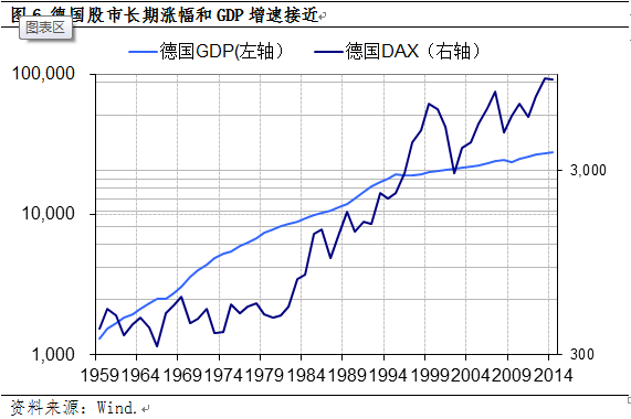 1950-2014年,德国GDP年均增速5.72%,股市年均增速5.81%;