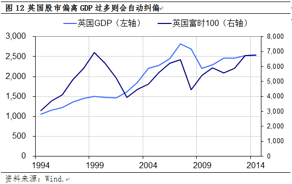 1994-1999年,英国股市连续5年大幅上涨,年均增速为17.7%,同期GDP年均增速只有7.2%;随后,1999-2002年,英国股市连续3年大幅下跌,年均增速为-17.2%,与GDP匹配后才恢复正常;