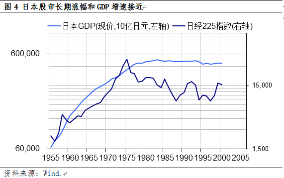 1969-1978年,日本股市年涨幅10.7%,低于GDP 大约14.1%的涨幅;随后,1978-1989年,日本股市年涨幅18.5%,高于GDP大约6.5%