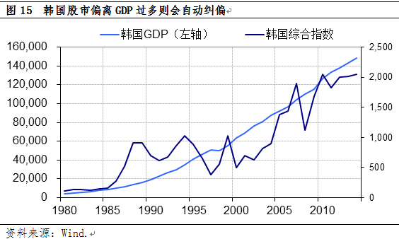 1980-2014年,韩国GDP年均增速11.29%,股市年均增速9.07%;
