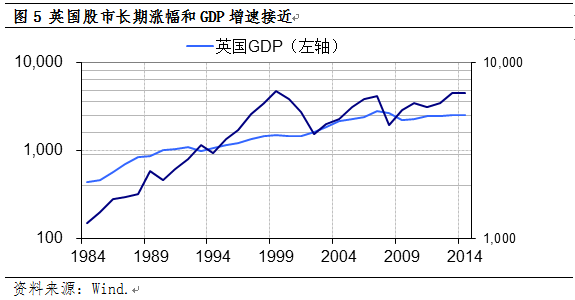 1984-2014年,英国GDP年均增速6.03%,股市年均涨幅5.84%。
