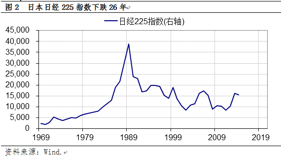 1969-1989这20年里,日本股市持续上涨,年均涨幅14.9%。但1989年日本经济危机爆发后,日本股市开始震荡下跌,至今已下跌26年,1989-2014年,日本股市年均涨幅-3.6%。
