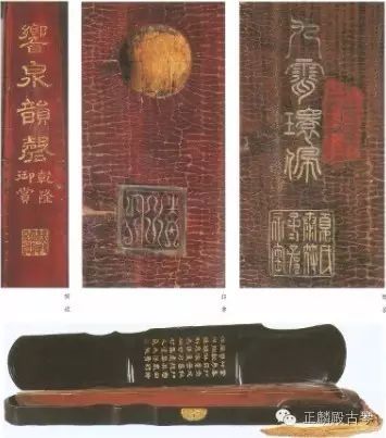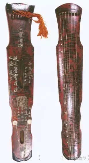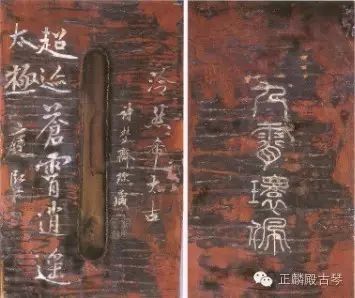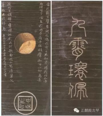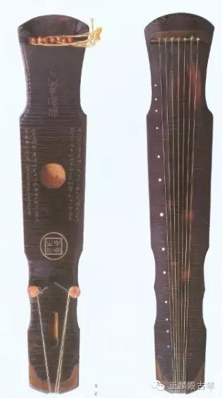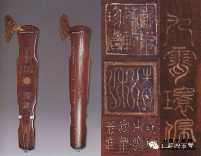 故宫之“九霄环佩”最为出名,其琴背池上方刻篆书“九霄环佩”4字,池下方刻篆文“包含”大印一方,池右刻“超迹苍霄,逍遥太极。庭坚”行书10字,左刻“泠然希太古,诗梦斋珍藏”行书10字,及“诗梦斋印”一方。