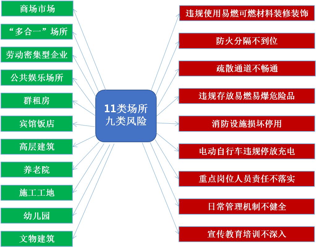 为有效防范化解重大消防安全风险,坚决遏制群死群伤火灾事故,根据《国务院安委会办公室关于开展“防风险保平安迎大庆”消防安全执法检查专项行动的通知》(安委办〔2019〕7号)要求,11类场所针对存在的九类消防安全风险开展“三自主两公开一承诺”工作。该项工作旨在强化单位消防安全主体责任,着力提升单位的自防自救能力。