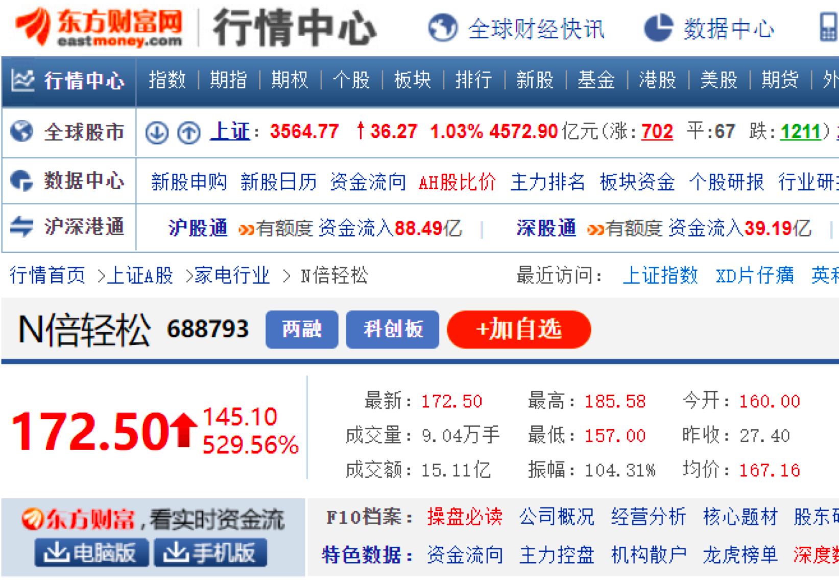 今日,国内健康产品创新研发的高新技术企业倍轻松正式上市。在发行价27.40元基础上,开盘价为160.00元,最新股价172.50元,涨幅超过5倍,达到529.56%,在今天上证指数多数飘“绿”的情况下,倍轻松表现让人眼前一亮。