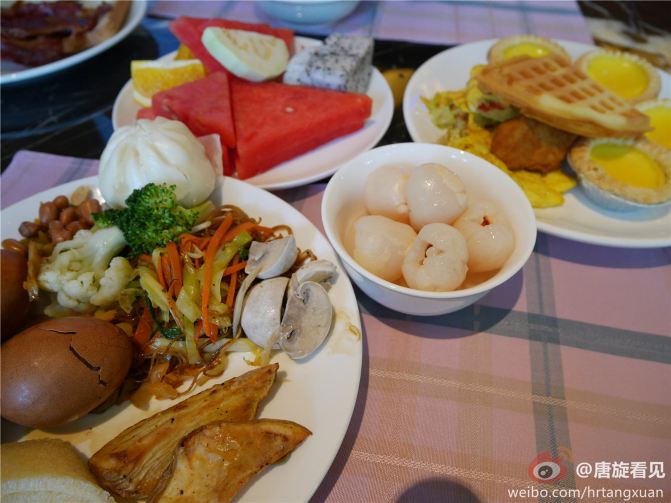 各类蛋糕面包、甜点,面条儿、米饭、粥类、寿司甚至还有粤式甜点,应有尽有。