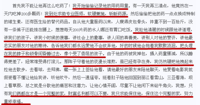 《底线》长文中,她详细记录了助老公“重生”的种种细节,具体到药的数目、体重等,非常细心、体贴。