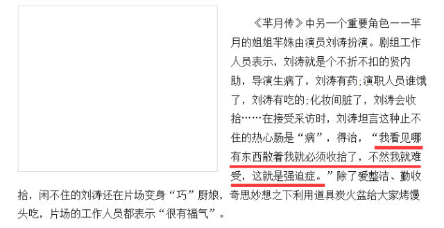 拍戏的时候刘涛很受剧组喜欢,工作人员觉得她很热心肠,连化妆间脏了也要去收拾;但这样的“好评”,连刘涛也觉得“是病,得治”。