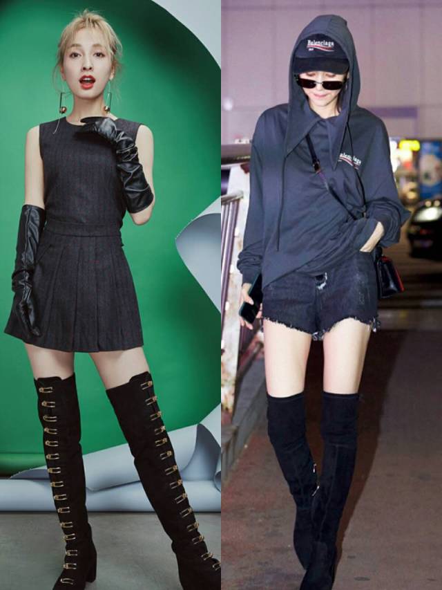 吴昕的杂志风格基本都是潮帅为主,但是潮流的元素不一定适合她。长筒靴贴紧大腿,能在视觉上又瘦又长是它街拍的作用。
