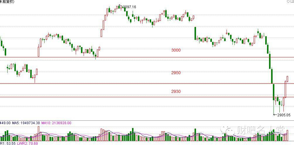 今天全天缩量震荡,尾盘杀跌,由于今天没有回踩2930,所以没有到我们预判的买入点位!明天是周五,以今天大盘成交2065亿金额计算,只要明天成交金额不大于3400亿,那么周线级别收盘后,肯定会显示缩量下跌状态!我们一直坚持我们的判断,只不过是区间震荡,上限3060,下限2850的区间!所以明天若继续下跌,可分仓进场,首选短期资金入场迹象明显的品种!