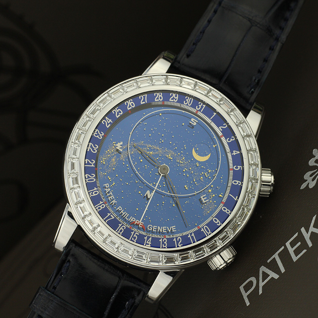 为了实现夜间移动天空迷人的视觉,百达翡丽开发了一套以不同速度旋转的叠加圆盘系统,传达出令人惊叹的深度印象。背景是由279颗牙齿的一个蓝宝石晶体盘提供的,它跟踪月球的轨道位置。通过行星齿轮系统,它还带动一个小圆盘,在小圆孔内显示月相。上面有一个356个齿轮,旋转着一个透明的圆盘,它描绘了前面的天空图,另一边是银河的代表。三个圆盘,每一个只有十分之二毫米厚,由蓝宝石水晶玻璃保护,里面有一个椭圆形的轮廓,可以从日内瓦和所有其他地方看到同样的天空。