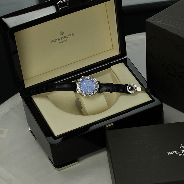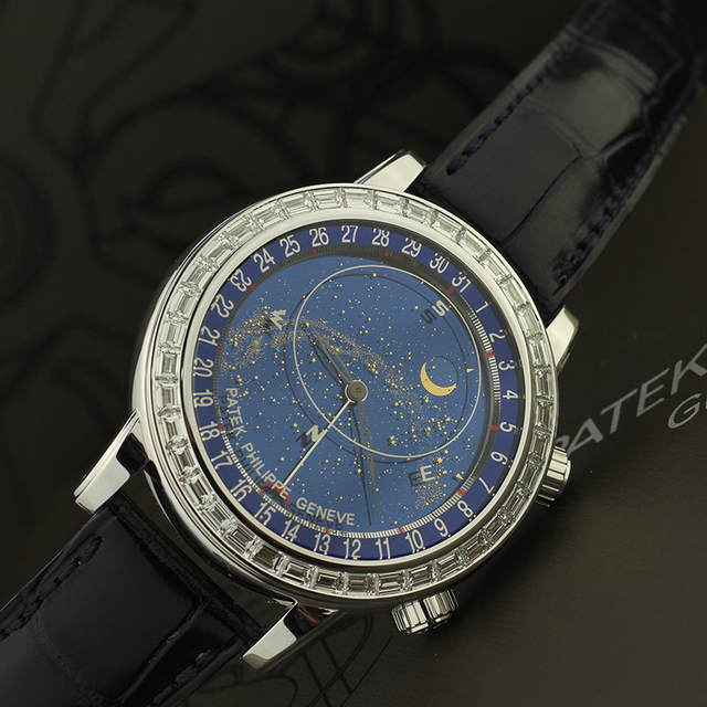 百达翡丽6104G-001,一个百达翡丽天文大复杂,提出了一些功能,是非常罕见的手表。它永久展示在北半球的盖天,仿效的恒星的视运动以及月球周期中月亮的位置和阶段。这个迷人的天体芭蕾包围38面包钻石镶嵌在边框的火灾是由selfwinding口径240路CL C运动舞蹈,尽管其复杂度只有6.81毫米高。天文指示由一个中心日期手补充,指针指向刻度盘最外围的日期刻度。