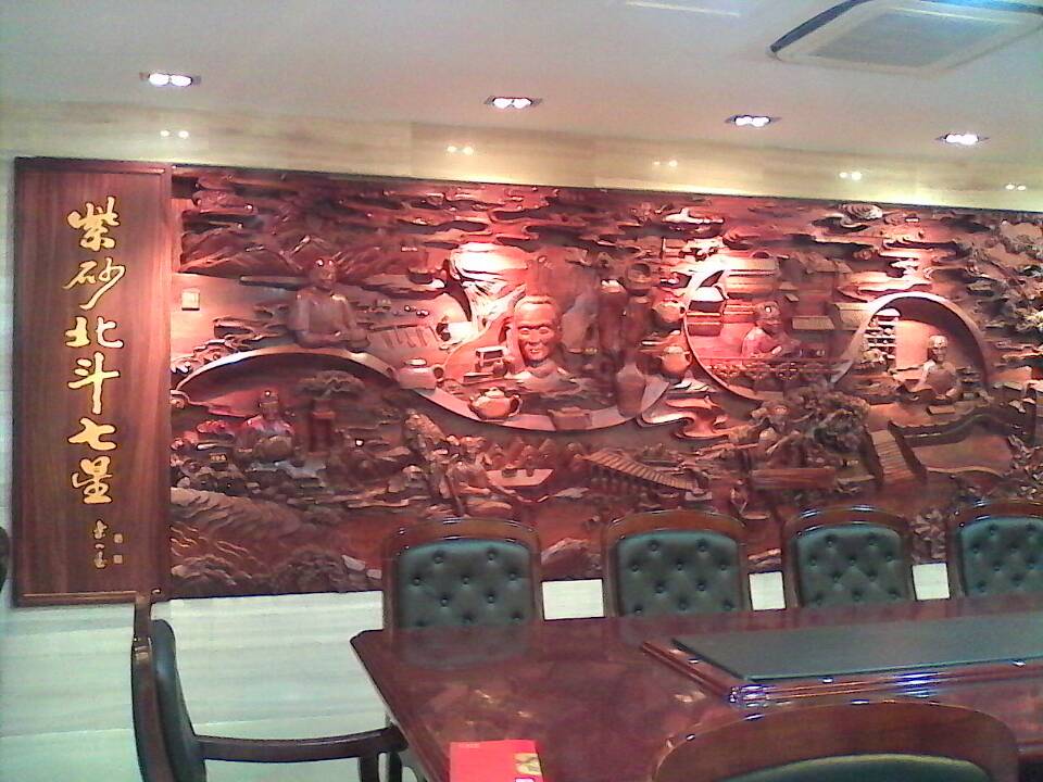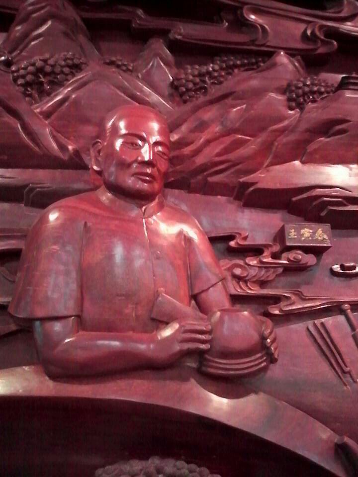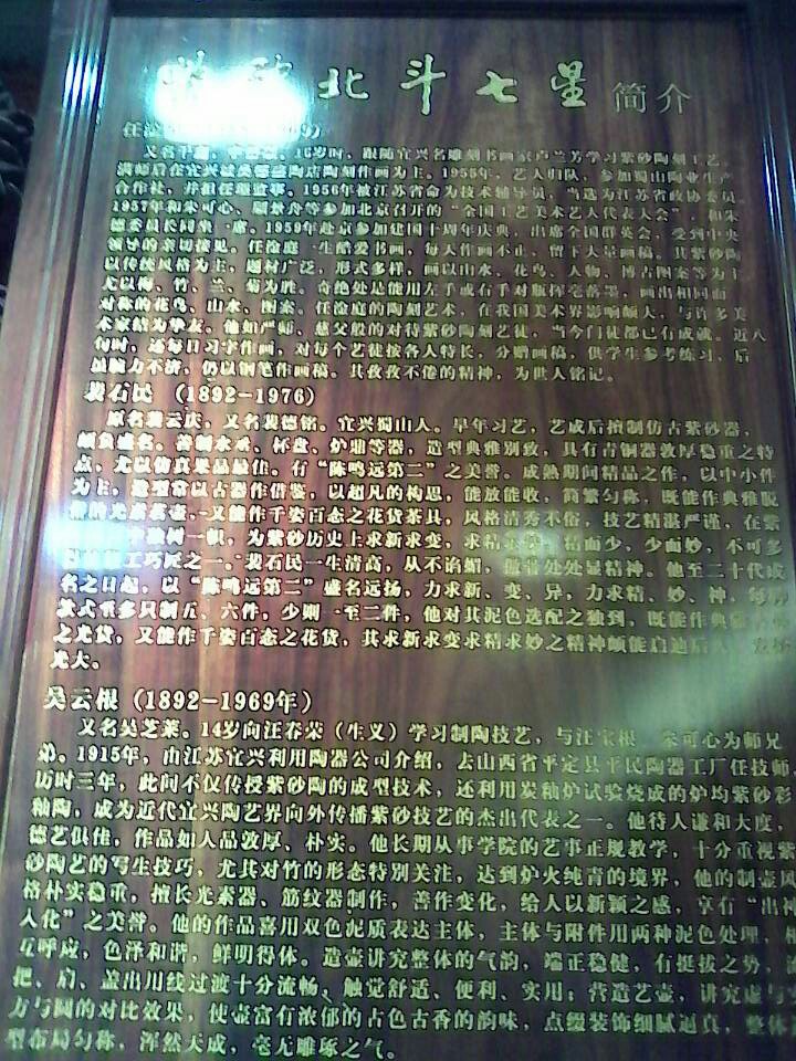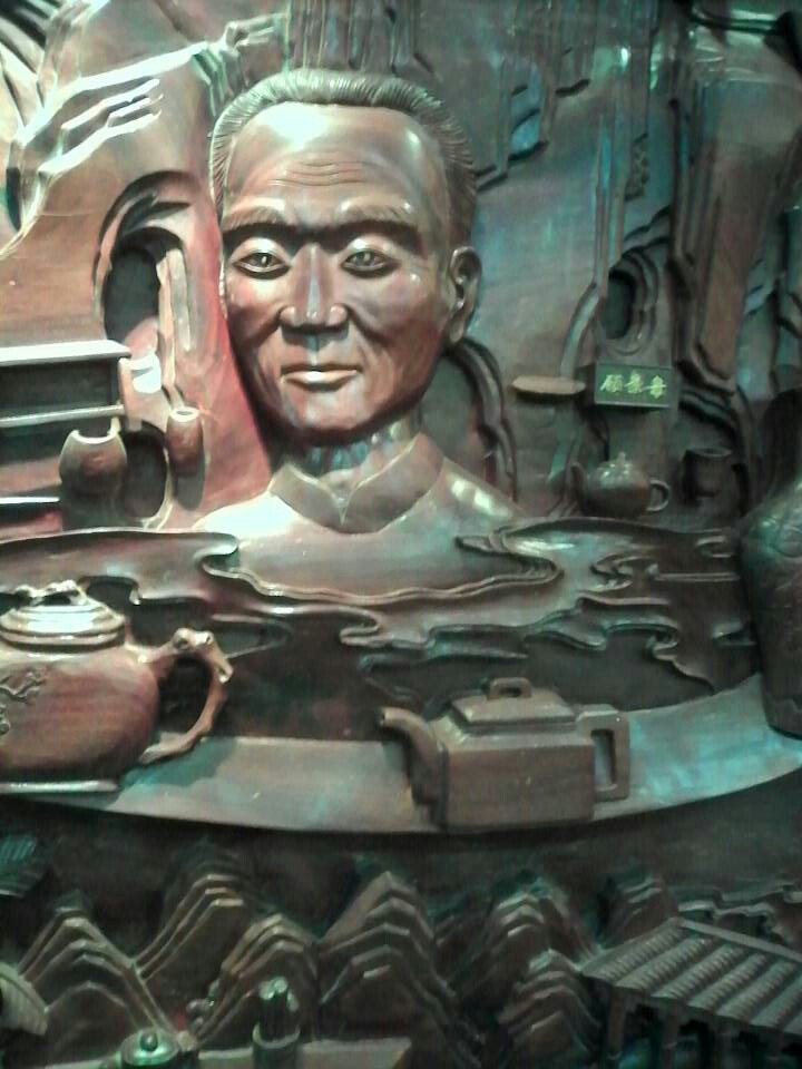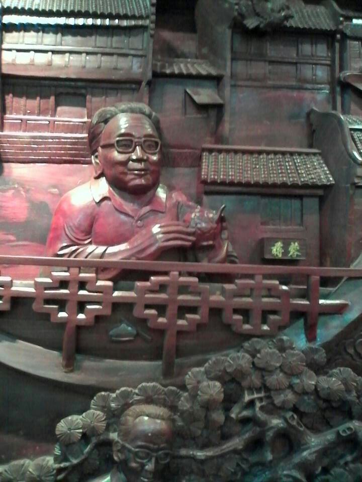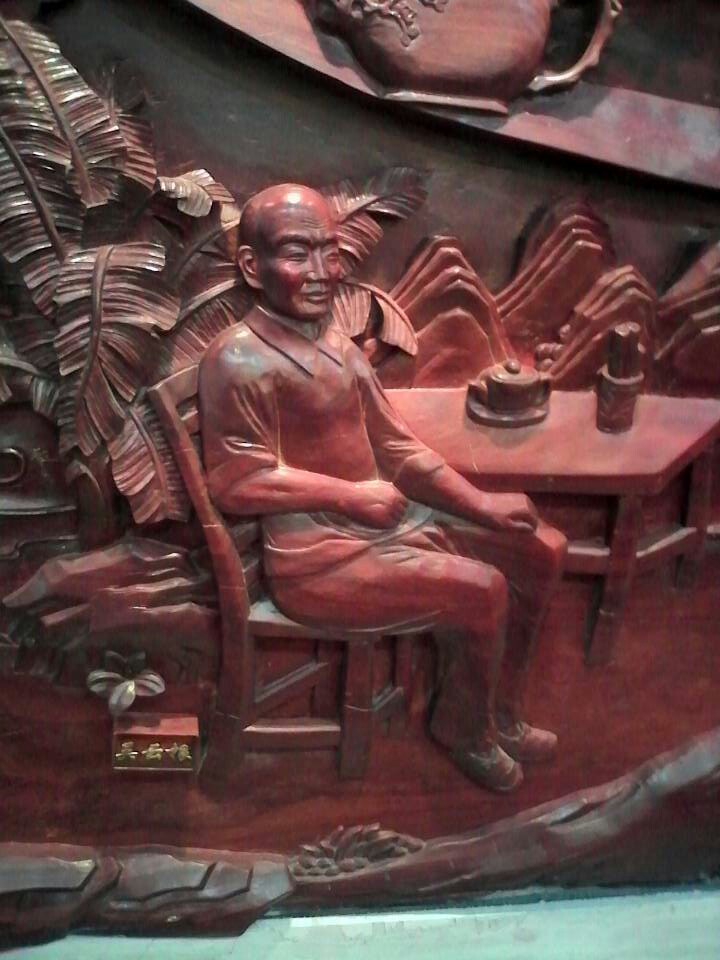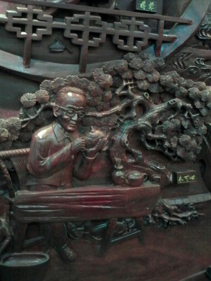 大家仔细看,木雕的主体部分,从左到右第一段,上面是王寅春,下面是任淦庭。第二段,上面是顾景舟,下面是吴云根。第三段,上面是蒋蓉,下面是朱可心。第四段是裴石民。