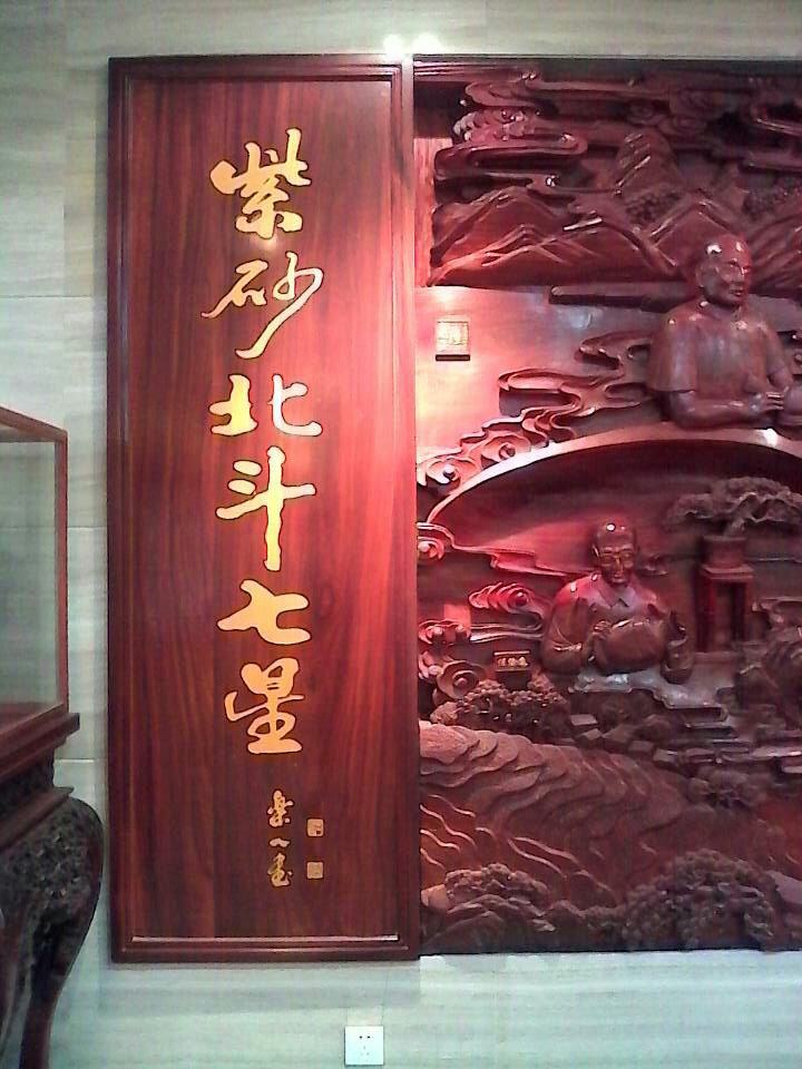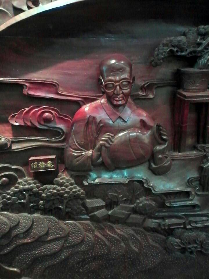 整块木雕分为三块。头部是鲍志强大师的题字,中部是七大老艺人的木雕形象,尾部拍不到。