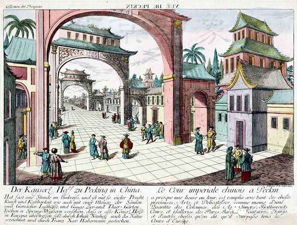 这些画中,最早的一批是1665年荷兰人约翰·尼霍夫跟随荷兰使团访问清廷时创作的《荷兰东印度公司使团觐见鞑靼可汗》组画。因为当时清廷礼仪十分严谨,官员思想保守,许多场景都是尼霍夫事后依靠记忆补画,与历史中的记载出入甚大,但却是西方人第一次直观地了解到充满神秘色彩的东方大国。