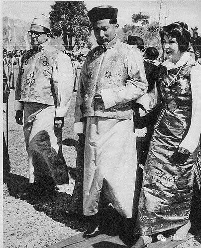 1963年锡金末代老王和他的美国王后婚礼,锡金老王扎西郎加(中),他的儿子也就是末代锡金国王巴登郎加(右),还有巴登郎加的第二任妻子美国白人厚朴库克,后面的是锡金王家卫队。