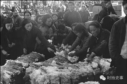 1948年12月-1949年1月,上海,穷人撕开码头上的棉包。 很多人在内战的最后一个冬天饿死或冻死