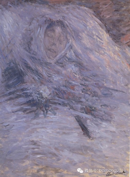 然而,上天并没有眷顾为爱而生因爱所累的卡米尔,生命之火日渐微弱了。守护病中妻子的莫奈,极力想挽住妻子的容颜,于是忍着极大的悲伤为她画了《临终的卡米尔》。他后来回忆说,在卡米尔的病床前,我十分本能地对那已无表情的年轻面孔仔细端详,观察搜索死亡在她面孔上引起褪色的迹象,看到的是蓝色、黄色和灰色的细微变化。于是,萌生出一个念头,要为这即将离开我的爱人画最后一幅画。