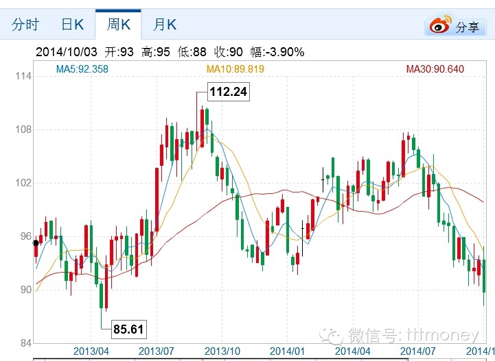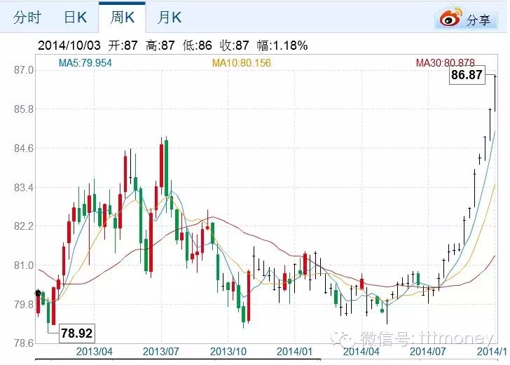 5、最瞧不上黄金价值的是美国人,因为人家国家强大,对未来有信心,有稳定的预期。所以巴菲特说:所谓黄金,就是从非洲或某些地方的地底下挖出来,然后我们将它融化,再挖一个洞把它埋起来,花钱雇人看守着。如果火星人看到我们提炼、存储黄金的这一幕,他们一定挠头在想这到底是为什么。美联储的官员比较含蓄,他们这样表示对黄金的蔑视:伯南克说,没有人真正理解黄金价格,我也不会装着理解它。耶伦说,黄金是“神秘之物”。(下图:近期美元指数牛气冲天,这是周K线)