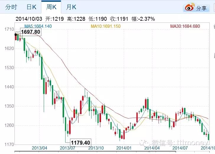 1、国庆黄金周期间,纽约黄金期货价格再次跌破每盎司1200美元,报1191美元。自2011年9月告别1923.2美元以来,跌幅已达38%。每盎司1191美元,对应的人民币价格应该是多少元1克?1191×6.14÷31.1=235元/克。目前国内市场实物黄金的零售价格是多少,我不清楚。但应该比235元高一些。(下图:纽约黄金周K线)