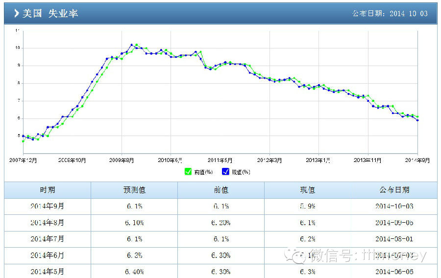 4、自美元跟黄金脱钩后,两者就分别坐到了“跷跷板”的两头。一般来说,美元升值的时候金价就下跌,反之亦然。当然,国际局势的恶化,以及突发较大自然灾害,也会导致黄金价格上涨。黄金越来越被当做一种避险的工具。(下图:美国近期失业率)