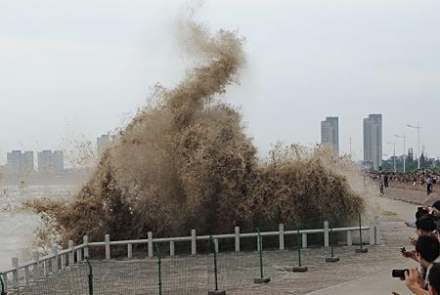 2014年8月13日下午3时左右,钱江大潮如千军万马之势涌向杭州下沙七格沿岸,令许多观潮者、行人在防护栏内躲闪不及,被冲倒在地。