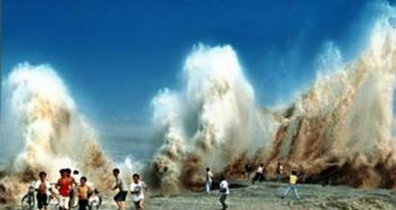 地利:跟钱塘江口状似喇叭形有关。钱塘江南岸赭山以东近50万亩围垦大地像半岛似地挡住江口,使钱塘江赭山至外十二公里段酷似肚大口小的瓶子,潮水易进难退,杭州湾外口宽达100公里,到外十二工段仅宽几公里,江口东段河床又突然上升,滩高水浅,当大量潮水从钱塘江口涌进来时,由于江面迅速缩小,使潮水来不及均匀上升,就只好后浪推前浪,层层相叠。其次还跟钱塘江水下多沉沙有关,这些沉沙对潮流起阻挡和摩擦作用,使潮水前坡变陡,速度减缓,从而形成后浪赶前浪,一浪叠一浪涌。